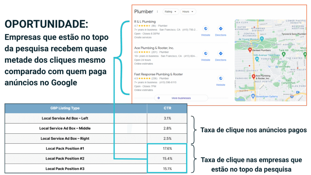 Mas os dados mostram que o topo do Local Pack traz muito mais cliques do que os anúncios pagos.