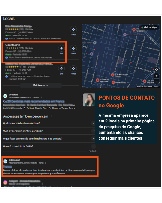 Quando alguém procura pelo seu serviço na sua cidade, ele vê anúncios pagos e resultados orgânicos no Google.